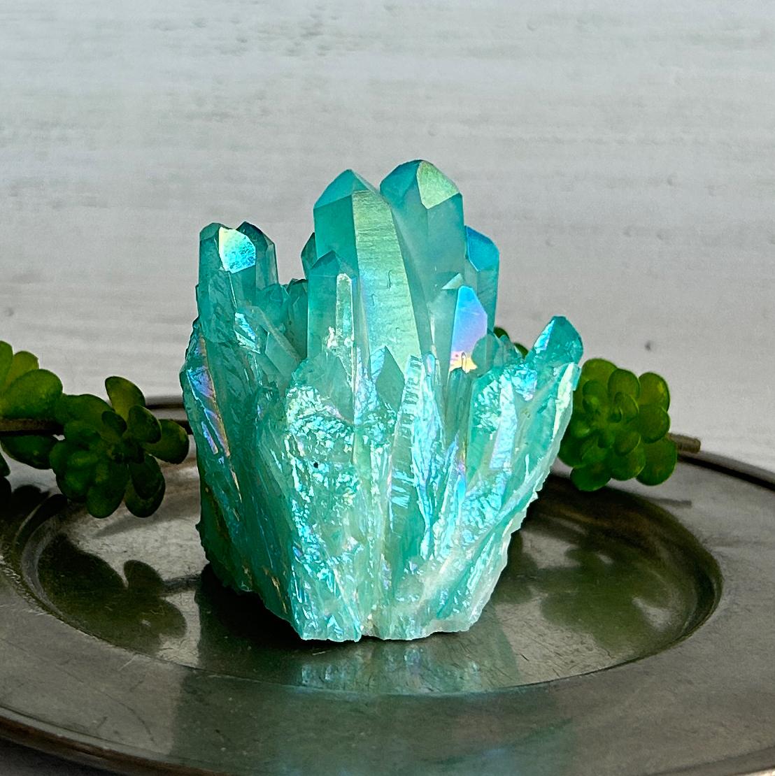 天然水晶に金属を蒸着させたことで生まれる虹色の光彩が、角度によって表情を変え、空間にやさしい輝きを広げてくれます。